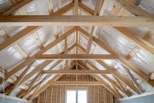 Wooden beam ceiling structure in modern sustainable architecture, highlighting natural materials and design