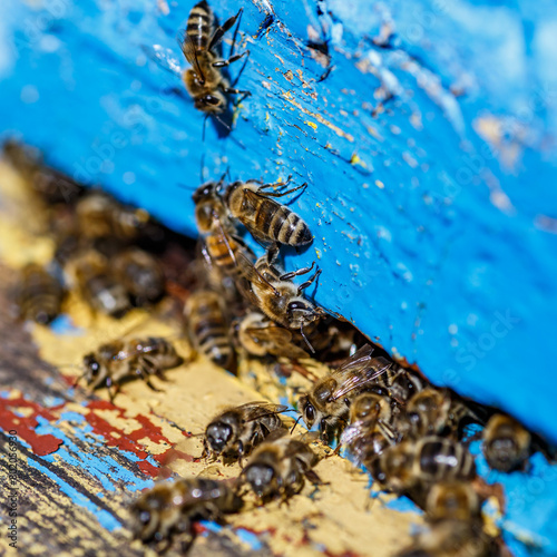 Wooden beehive and bees.The bees return to the beehive after the honeyflow.Honey bees on home apiary, apiculture concept
