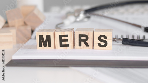 wooden block form the word MERS with stethoscope on the doctor's desktop. medical concept.