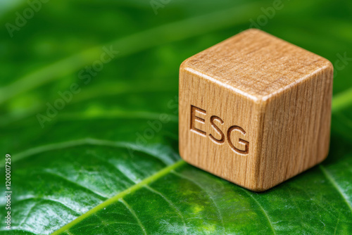 Wooden block with ESG concepts placed on a green leaf illustrating sustainability in business practices