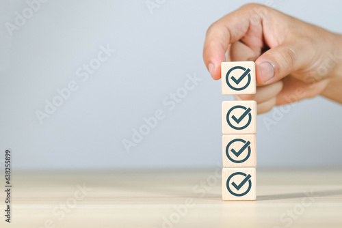 Wooden blocks display markers to summarize the details of the work. Document checklist and online quality assessment standards