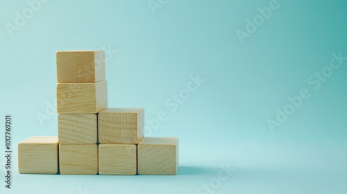 Wooden blocks in a stair formation on a light blue background, demonstrating a clear path to business growth. Plenty of empty space for promotional text or logos.