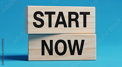 Wooden blocks spell out start now against a vibrant blue background encouraging immediate action