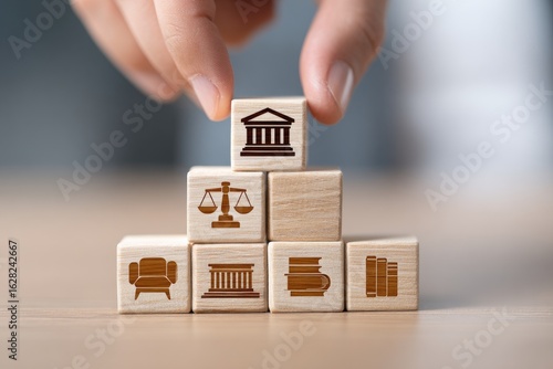 Wooden blocks stacked in a pyramid, each with a legal or judicial symbol. A hand places a block onto the top