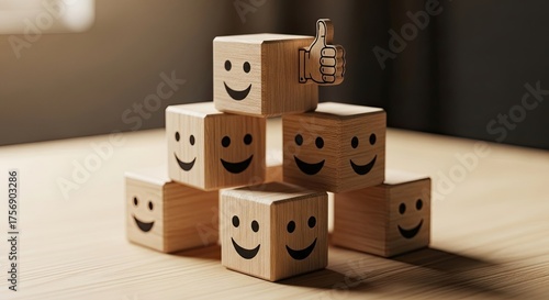 Wooden blocks stacked with smiling faces and thumbs up symbol concept