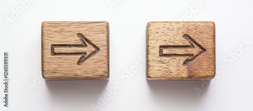 Wooden blocks with arrows pointing in opposite directions on a white background for concepts of choice, decision-making or direction in business