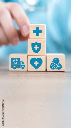 Wooden blocks with health and medical icons placed carefully by a hand in light blue shirt, digital healthcare network and first healthcare insurance theme
