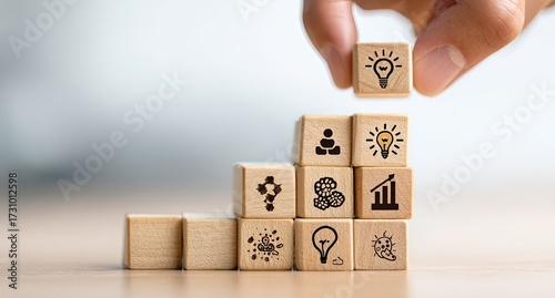 Wooden blocks with icons forming a staircase, a hand placing a block with a lightbulb symbol