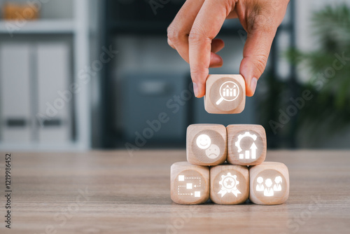 Wooden blocks with icons symbolizing quality control, efficiency, and performance in business settings.