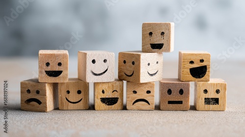 Wooden blocks with smiley faces stacked in a playful arrangement, showcasing various emotions like happiness, sadness, and excitement on a blurred background.