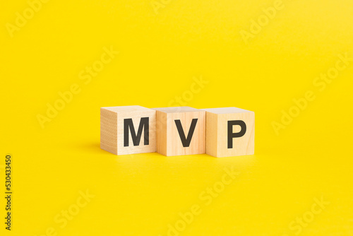 wooden blocks with text MVP on yellow background. business concept