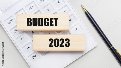 Wooden blocks with the BUDGET 2023 Iie on a light background on a white calculator. Nearby is a black handle. Business concept