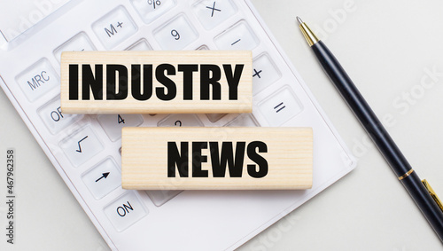 Wooden blocks with the INDUSTRY NEWS lie on a light background on a white calculator. Nearby is a black handle. Business concept