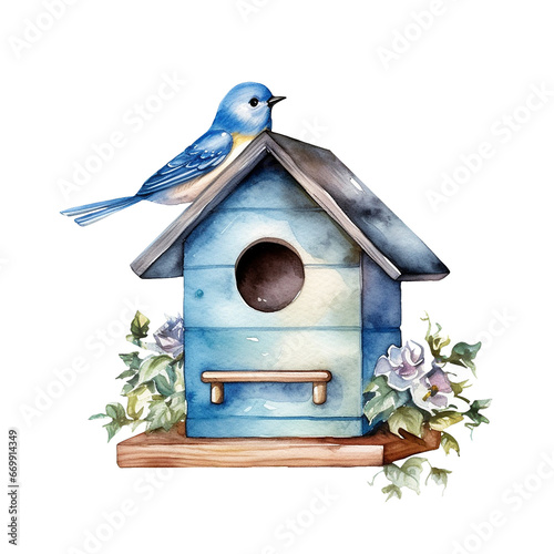 wooden blue bird house, with spring flowers and a blue bird, isolated on a transparent background, watercolor style clipart illustration