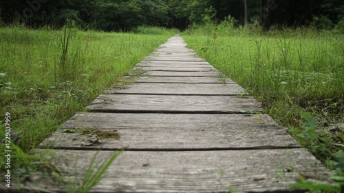 Wooden boardwalk path through lush green meadow.