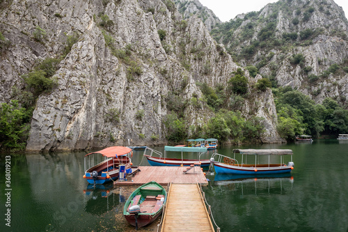Wooden boats tied to a wooden pier on the lake