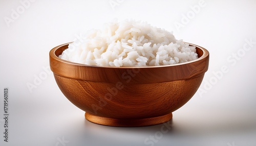wooden bowl filled with cooked white rice isolated on a plain background for culinary presentation