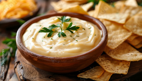 Wooden bowl filled with creamy queso dip is garnished with parsley, served alongside crispy tortilla chips perfect for national queso day celebrations or appetizing snacks