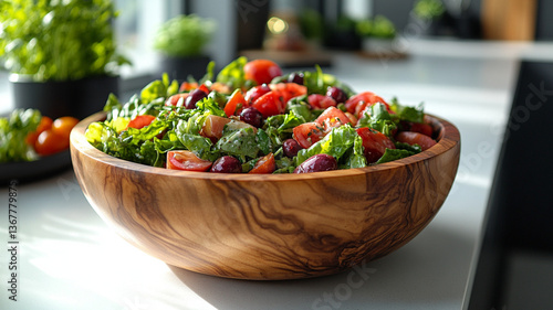 Wooden bowl with fresh vegetable salad.
