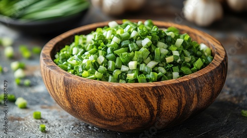 wooden bowl with freshly chopped green onions isolated on transparent background