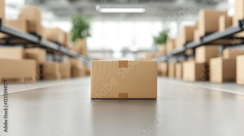 Wooden Box on Warehouse Floor with Stacks of Cardboard Boxes
