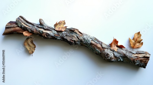 Wooden branch with autumn leaves on a light background showcasing natural textures and colors in seasonal decor.