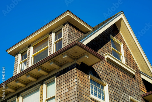 Wooden building exterior with weathered and aged pannels and white accent paint with visible windows and victorian style