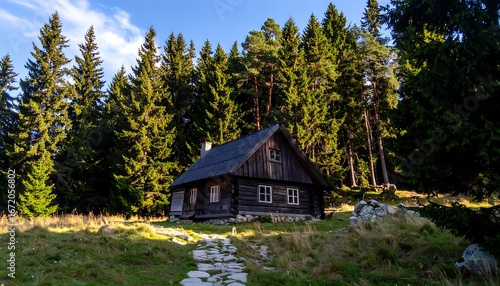Wooden Cabin in Pine Forest.
