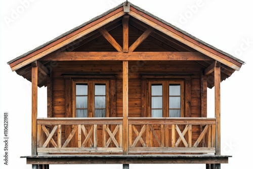 Wooden cabin with balcony, gabled roof, windows.