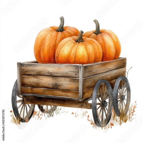 Wooden cart with orange pumpkins. Autumn. Illustration for Halloween. Isolated element