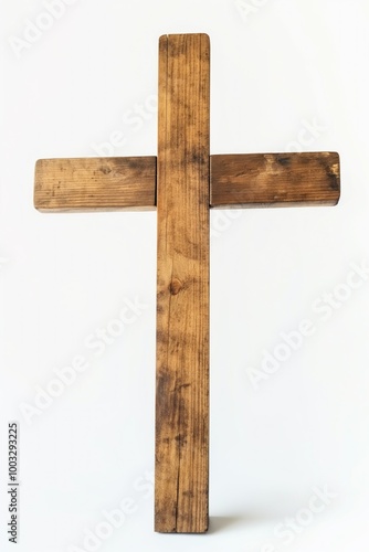 Wooden cemetery cross on white background, isolated object of faith, spirituality. Symbol of hope, forgiveness, salvation in Christianity. Simple, yet profound, expression of devotion, reverence.