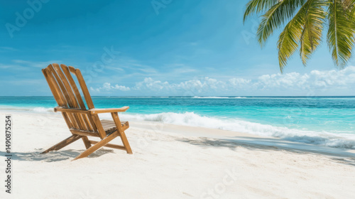 Wooden chair on tropical beach overlooking turquoise ocean under clear blue sky