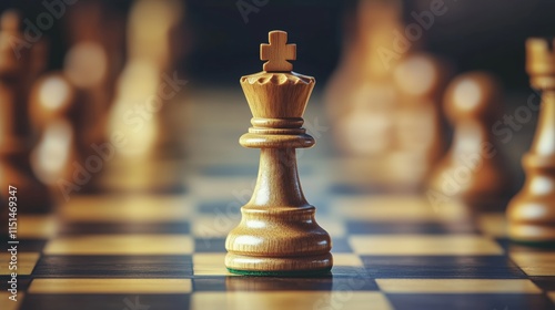 Wooden Chess King Piece on a Chessboard. A close-up of a wooden chess king piece placed prominently on a chessboard. Perfect for themes related to leadership, strategy, planning, and decision-making.