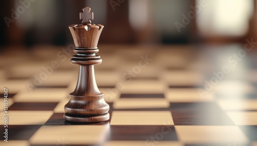 Wooden chess king piece standing on a chessboard symbolizing strategy leadership and competition with a blurred background for business and success concepts