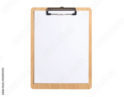 Wooden clipboard holding a blank white sheet of paper secured by a metal clip at the top.