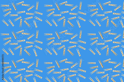 Wooden clothespin isolated on blue background. A clothespin, or clothes peg is a fastener used to hang up clothes for drying, usually on a clothes line.