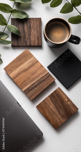 Wooden coasters, coffee cup, laptop, minimalist workspace