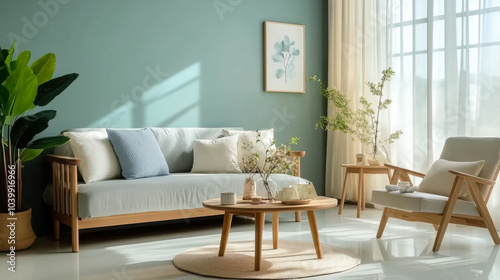 Wooden coffee table and chair. gray sofa against green wall