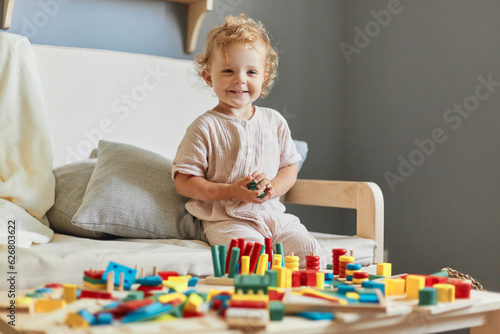 Wooden construction set. Montessori learning approach. Cognitive development puzzles. Happy smiling little blonde baby girl palying with wooden sorter toys at home interior.