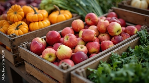 Wooden crates with apples, pumpkins, greens at farmers' market, dawn light, warm rustic vibrant scene.