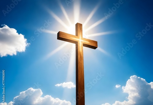 Wooden cross against a blue sky with clouds and radiant sunlight