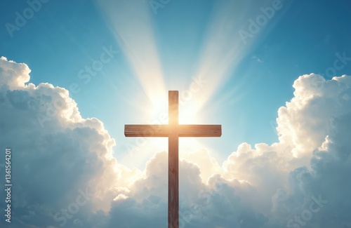 Wooden cross against radiant blue sky. Sunlight bursts behind the cross symbol of hope, faith. Spiritual background, religion, heaven, divine peace. Calmness inspires prayer.