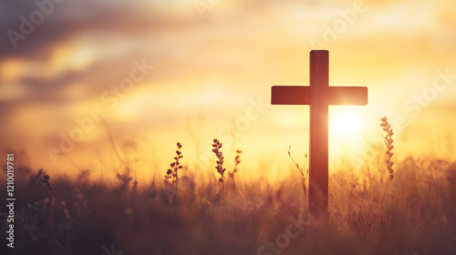 Wooden Cross in a Sunlit Field at Sunset Creating a Warm and Peaceful Atmosphere : Generative AI