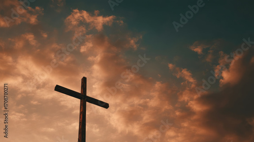 Wooden cross silhouetted against dramatic sky filled with clouds during sunset, evoking sense of peace and reflection