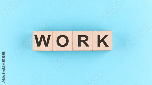Wooden cube block with text WORK on the blue background