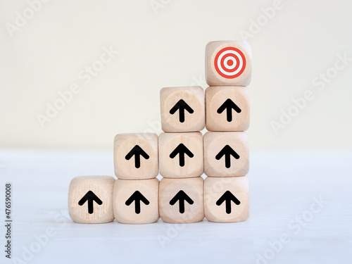 wooden cube with arrow pointing to target red icon Ideas for the success of business growth