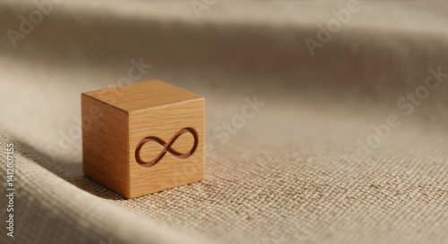 Wooden cube with infinity symbol engraved on linen fabric background. Conceptual object for sustainability campaigns, spiritual practice promotion and endless possibilities philosophy