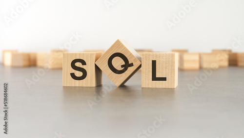 wooden cube with the letter from the SQL word. wooden cubes standing on gray background. SQL - short for Structured Query Language
