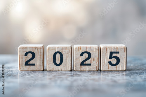 Wooden cubes arranged to show 2025, symbolizing fresh starts and new beginnings. Anticipating change and opportunities. Captures celebration and resolutions for the upcoming year
