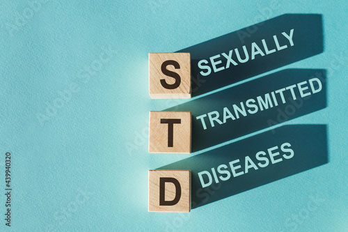 Wooden cubes building word STD - (abbreviation Sexually transmitted diseases) on light blue background.